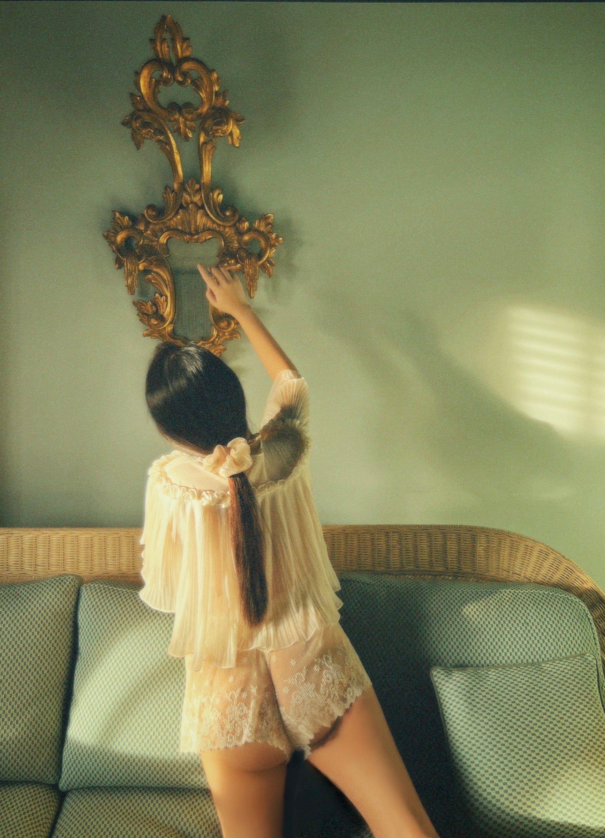 Features scalloped edges, and fine pleated lace. Waistband is elasticated, adding a gentle ruching effect.