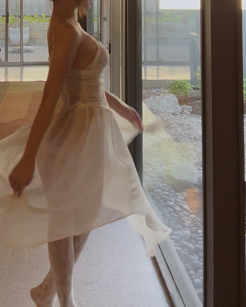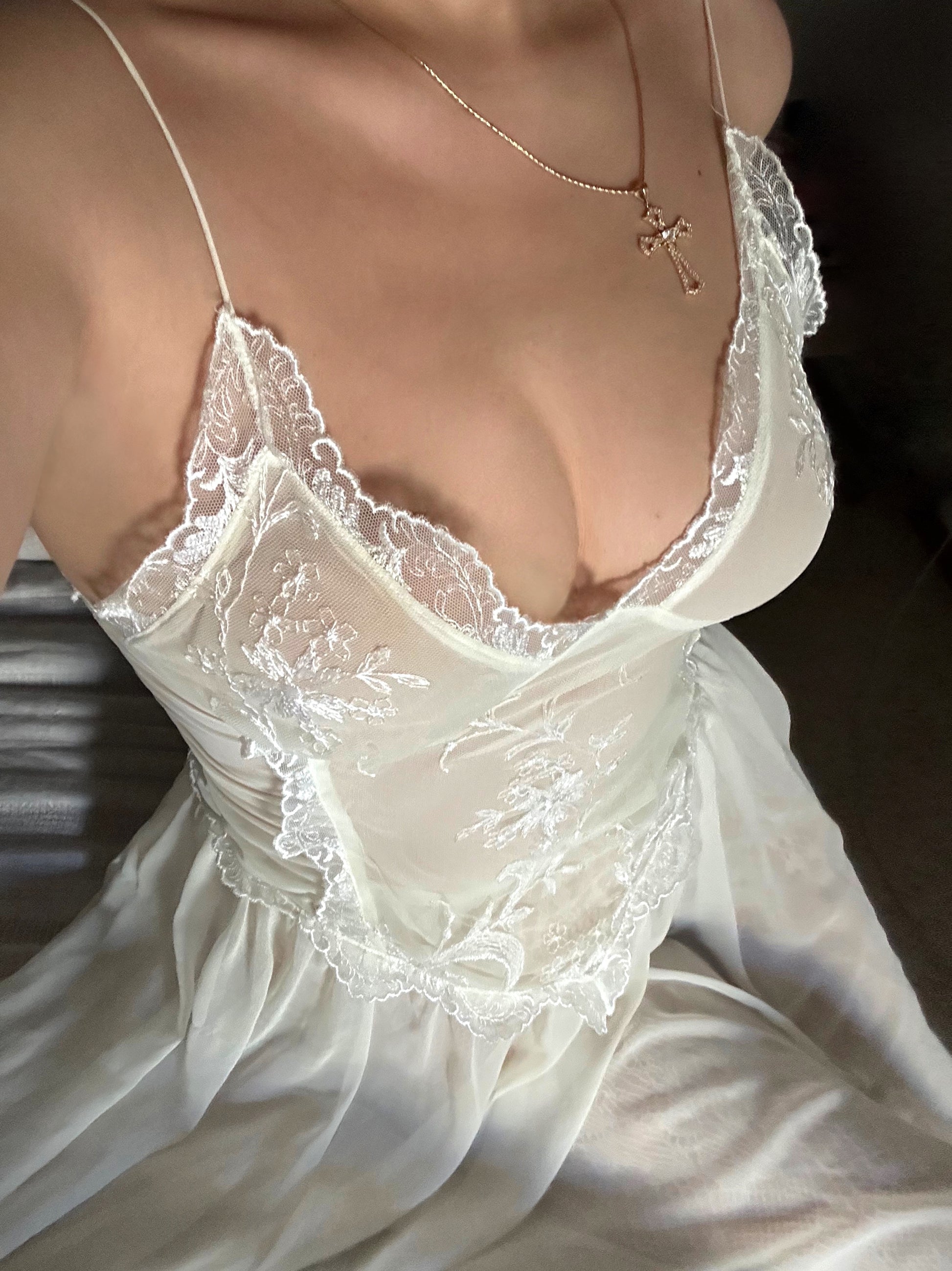 Features sheer ivory chiffon with floral embroidery and scalloped lace trim. Soft bias cut with delicate draping.